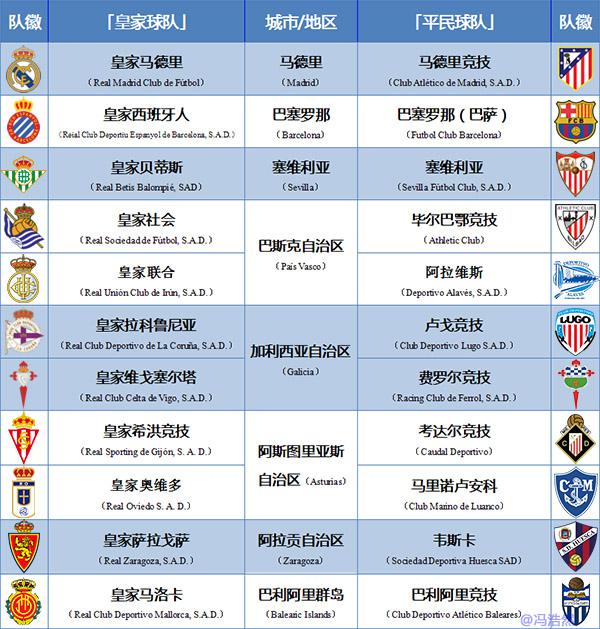 图注:西班牙“皇家球队”和“平民球队”,区别在于队名中是否含皇家称号及队徽是否有皇冠