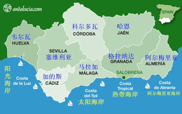 图注:安达卢西亚行政区划及四大海岸;图片引自Andalucia官网