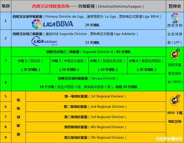 图注:西班牙足球联赛系统,右附联赛主管机构
