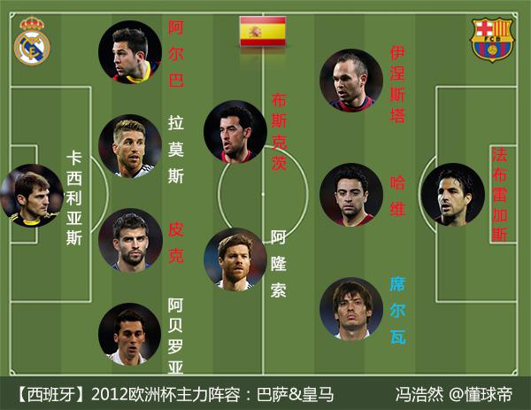 图注:西班牙2012年欧洲杯主力阵容,除了席尔瓦之外,其他皆为皇马帮&巴萨帮;阿尔巴欧洲杯期间转会巴萨,他本是巴萨青训出身