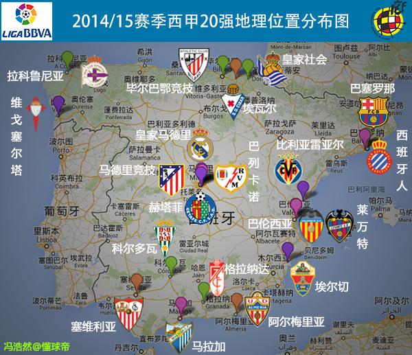 首先,依然以识图入题,你能够辨识出地图中2014/15赛季西甲20强吗?嗯,欢迎走入足球地理课堂!