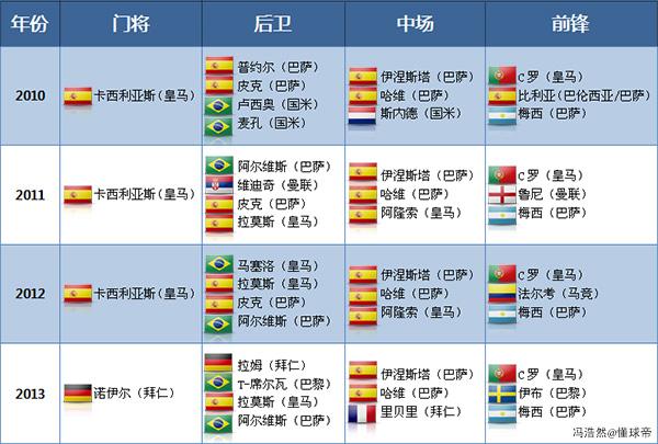 图注:2010~2014年,FIFA世界最佳阵容名单,西班牙和巴萨系、皇马系球员威震天下