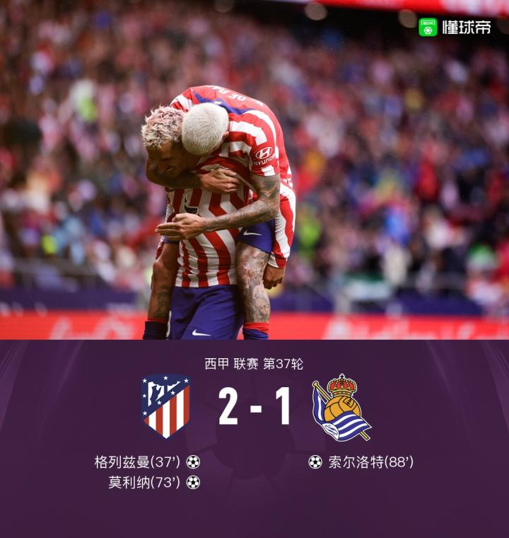 【马竞2-1皇社,格列兹曼传射,客队输球仍提前一轮获欧冠名额】