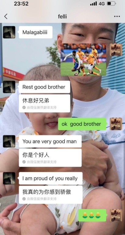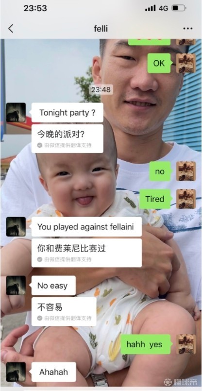 同时,刘军帅也晒出了他与前队友费莱尼的微信聊天记录,那句经典的“MLGB”再现。与费莱尼对抗过后,刘军帅已经是非常疲惫。另外,刘军帅也得到了费莱尼的夸赞:“好兄弟,好好休息,你是一个超棒的人,我真的为你感到骄傲。”