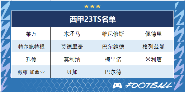 EA_SPORTS又是一年收官季,西甲联赛的冠军早早失去悬念,以防守拿下西甲的巴萨极为稳定;“西超”另外两强也不出意外地晋级下赛季欧冠。今年的西甲联赛,似乎有些平静,不过西甲23TOTS非常热闹,新人老将竞相出场。日前《FIFA系列》公布了23TOTS(赛季蓝)的西甲名单,共计包含15人,他们也会出现在FIFA ONLINE4里,和我们度过暑期假日。