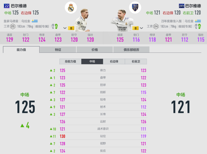 23TS巴尔维德能力值可能在111左右,和现在的巅峰卡22U相比,二者的差距应该不大。巴尔维德能打前腰、边前卫和后腰,全能的属性让人满意,只要工资没有太超标,相信在TS套和皇马套里,都是重要的中场强援。