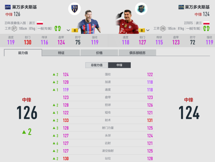 按照往年的规律,今年的23TS最高能力值预计是113,而莱万有机会接近这一数字。此前的TYN和22TS等赛季,对于莱万的双速有小幅提升,能力值很可能高于TY的23TS,在双速上预计接近130,让他的速度能稍微快一些。无解的射门能力,是莱万最优秀的特点,左右脚都能高难度进球,在门前的跑位抓机会很好,符合其西甲金靴的定位。