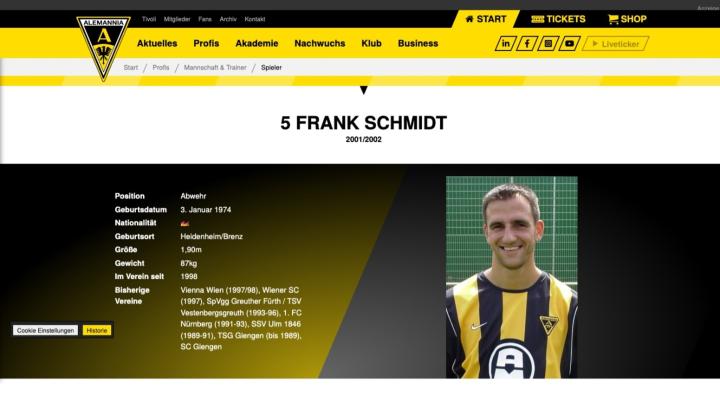 作为海登海姆当地人,弗兰克·施密特的球员生涯晚期(2003-07年)就在家乡的海登海姆度过,而他在退役几个月后,就地担任球队的主教练,至今已有16年,并且在2021年时又续约到了2027年,很可能成为一名像弗格森爵士和温格一样长期执掌一家俱乐部的传奇教头。