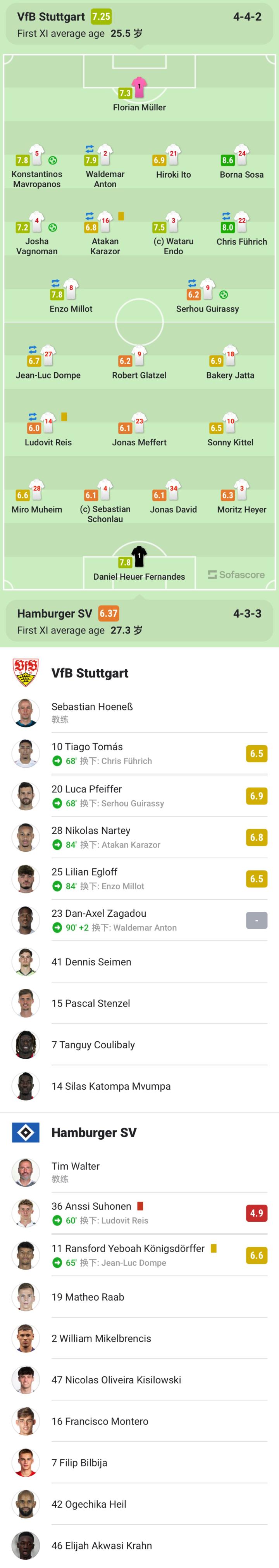 斯图加特首发:1-弗洛里安-穆勒、5-马夫罗帕诺斯、2-安东(90'23-扎加杜)、21-伊藤洋辉、4-瓦格诺曼、3-远藤航、16-卡拉佐尔(84'28-纳尔泰)、24-索萨、8-米约(84'25-埃格洛夫)、22-菲里希(68'10-蒂亚戈-托马斯)、9-塞罗-吉拉西(68'20-普法伊费尔)