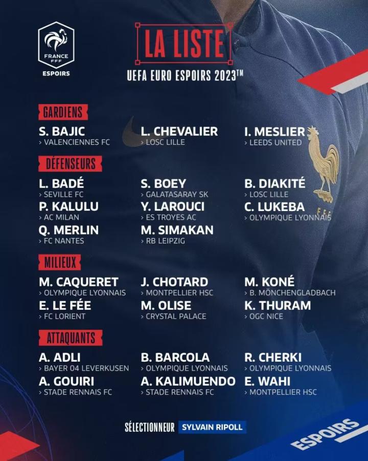 法国足球资讯法国U21国家队公布了欧青赛的最终名单,在这份23人大名单中,里波尔召入了博埃这样的新人,此外特吕菲尔和巴迪亚希勒还是因伤落选了大名单。