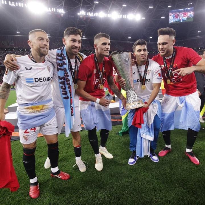 代表塞维利亚欧联杯夺冠,5名阿根廷球员捧杯合影留念ETChalmers @懂球帝2023-06-01 10:08代表塞维利亚夺得欧联杯冠军后,蒙铁尔、拉梅拉等五名阿根廷球员合影留念。塞维利亚夺得2022-23赛季欧联杯冠军后,蒙铁尔、戈麦斯、阿库尼亚、拉梅拉和奥坎波斯五名阿根廷球员围着阿根廷国旗,捧着欧联杯奖杯合影留念。对于蒙铁尔、戈麦斯、阿库尼亚三人来说,他们在同一个赛季夺得了世界杯冠军和欧联杯冠军。展开更多
