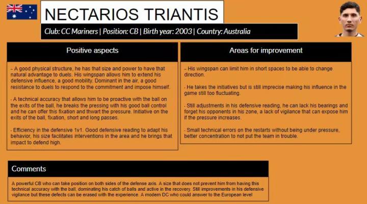 球员介绍:内克塔里奥·特里安蒂斯出生于2003年5月11日,场上司职中后卫。他本赛季出场24次,给中央海岸水手球迷留下了深刻的印象。他拿下了场均7.02的评分,位列澳超中卫第四。