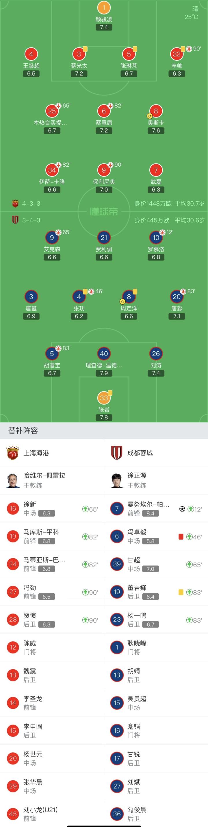 成都蓉城首发:33-张岩、26-刘涛、40-理查德、5-胡睿宝(83'23-杨一鸣)、20-唐淼(83'19-董岩锋)、4-张功(46'6-冯卓毅)、8-周定洋、3-唐鑫、10-罗慕洛(12'7-帕拉西奥斯)、21-费利佩、9-艾克森(65'39-甘超)
