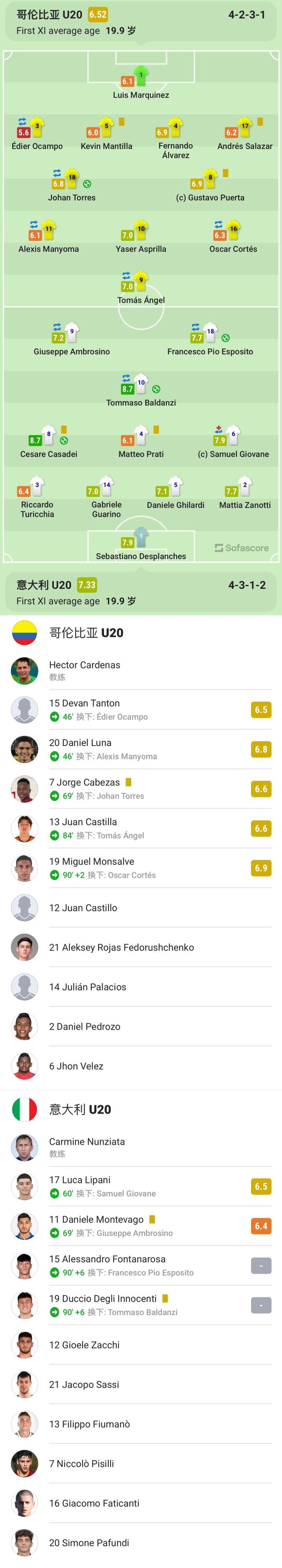 意大利U20首发:1-塞巴斯蒂亚诺-德普朗什、14-瓜里诺、2-扎诺蒂、5-吉拉尔迪、3-图里基亚、8-切萨雷-卡萨代伊、6-焦瓦内(60'17-卢卡-里帕尼)、4-马特奥-普拉蒂、10-巴尔丹齐(96'19-因诺琴蒂)、9-安布罗西诺(69'11-蒙泰瓦戈)、18-皮奥-埃斯波西托(96'15-丰塔纳罗萨)