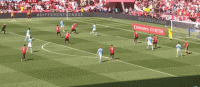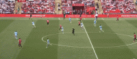 开场阶段,曼联曾尝试驱动高位压迫,京多安的闪电进球也没有让他们退缩。后场压力较大时,曼城选择用长传发动进攻,即便无法第一时间打出布丁连线,也可以通过争夺第二落点来推动进攻。中轴线上的高大球员较多,曼城的阵容兼具力量和技术,直来直去的打法不会造成频繁的球权易手,反而成为推动进攻的最佳方式。