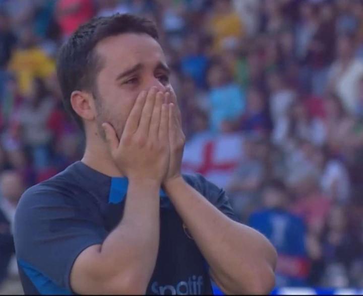 导演奇迹!巴萨女足主教练乔纳坦.吉拉德斯在赢得欧冠后流下了眼泪。