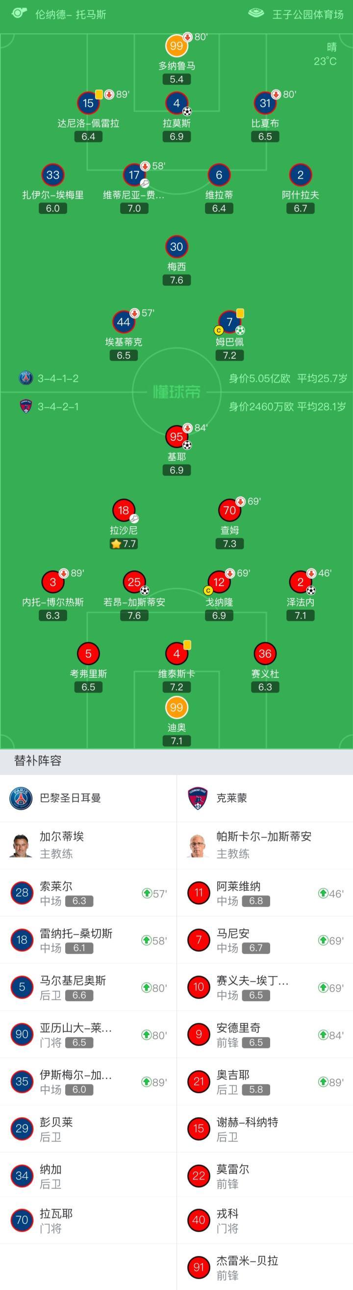 巴黎首发:99-多纳鲁马(80'90-莱特利尔)、2-阿什拉夫、4-拉莫斯、31-比夏布(80'5-马尔基尼奥斯)、6-维拉蒂、15-达尼洛-佩雷拉(89'35-伊斯梅尔-加尔比)、17-维蒂尼亚-费雷拉(58'18-雷纳托-桑切斯)、33-扎伊尔-埃梅里、7-姆巴佩、44-埃基蒂克(57'28-索莱尔)、30-梅西