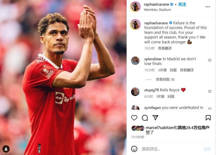 瓦拉内:失败是成功的基础;我们会变得更加强大来杯冰可罗 @懂球帝2023-06-04 12:48北京时间6月3日晚,曼联在足总杯决赛中1-2不敌曼城,错失冠军。赛后,瓦拉内更新了个人社媒。瓦拉内表示:“失败是成功的基础。我为这支球队和俱乐部感到骄傲。谢谢你们整个赛季的支持!我们会变得更加强大。”展开更多
