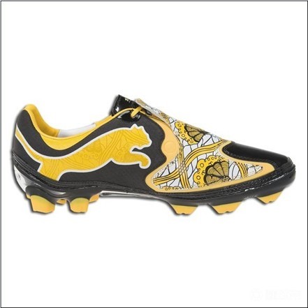 虽说普通市售版本的V1.10的重量也算是相当不错了,但是仍然不可否认和Nike刺客系列以及Adidas的F50系列在轻量化进程中还有差距。可是Puma好歹也是足球鞋产业的巨头,所以我们很快就看到了他相应的变化,发布了V1.10的SL(Super Light)超轻版本。主要的改进就集中在鞋面上,翻盖式鞋舌的设计被拿掉了,织物透气运用面积被削减了,还为其带来了更为轻薄柔软的人造超纤维面料。尽管发力爆射功能有所减退,可是其整体重量变得更为轻便舒适。V1.10 SL版本的单只鞋的重量被压在了200克以下,在当时已是最轻的足球鞋之一,更加符合球场上“幻影杀手”角色的球员需求。更是由于特别版本的原因,Puma V1.10 SL足球鞋还推出过品牌代言的特别配色版本,如上图就是一双施华洛世奇水晶特别版,上脚十分拉风!