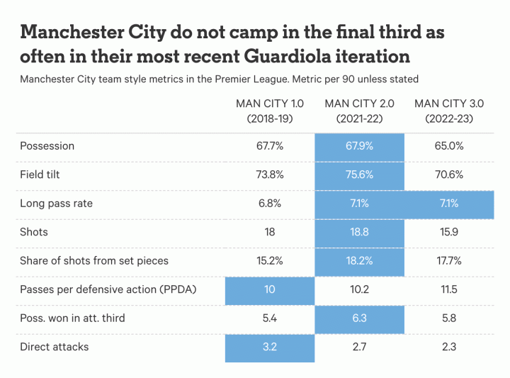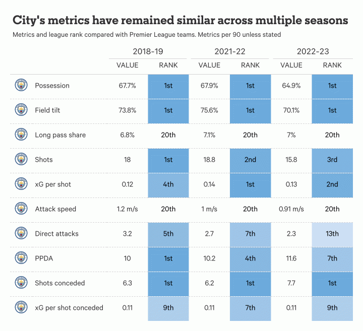 当然,与此同时,有些东西也是一脉相承的。比如,连续三个赛季冠决英超的控球率和场地倾斜度(译者注:一支球队在一场比赛中,在进攻三区的触球或传球占比),连续三个赛季垫底的长传占比,以及连续三个赛季最少的场均被射门次数。