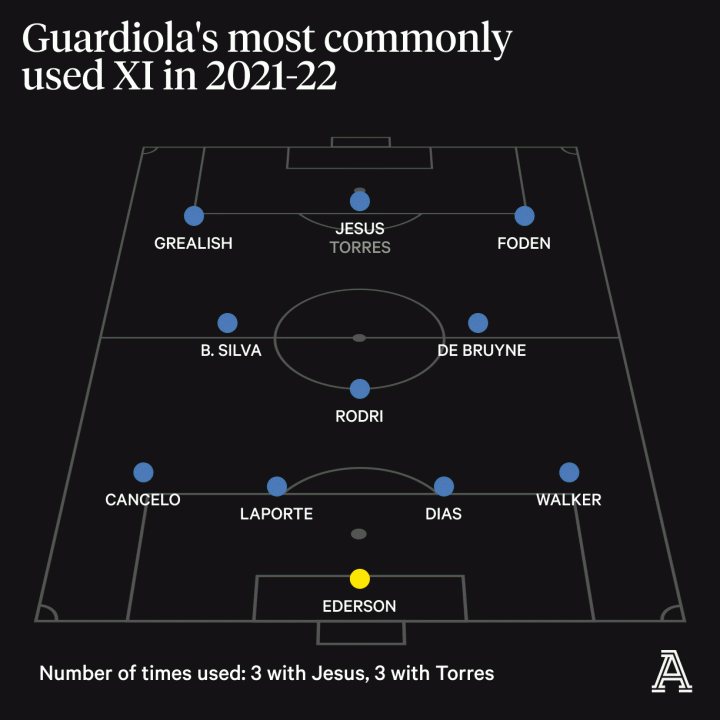 然后是2019-2021年,伪九号大行其道的时代。那是一个空前注重短传和控制的时代,出任伪九号的菲尔-福登或贝尔纳多-席尔瓦,有时候是费兰-托雷斯或者热苏斯,在大部分时间里的工作,就是在无数次传球过后,完成剑锋出鞘的最后一击。