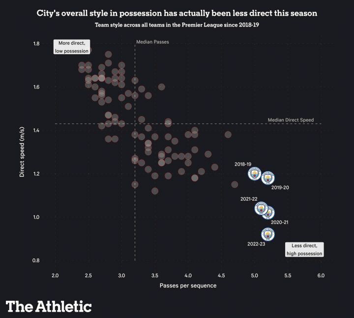 还有一些更令人惊讶的变化:尽管拥有令人生畏的反击大杀器哈兰德,曼城本赛季每90分钟的“直接进攻”次数,反而比前几年要更少。不仅如此,他们的平均推进速度,也是近三年最慢。如果不是特别强调,甚至会有一种“哈兰德根本就没来”的错觉。