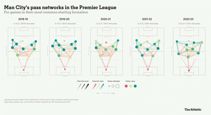 上图显示了,近几个赛季,曼城的传控体系是如何变化的。
