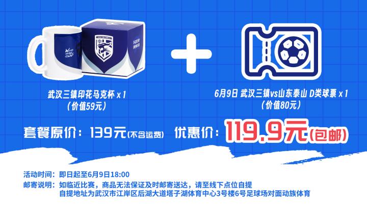 商城福利 | 主场球票+周边产品优惠套餐上线“武...武汉三镇足球俱乐部 @懂球帝2023-06-06 10:52商城福利 | 主场球票+周边产品优惠套餐上线 “武汉三镇足球俱乐部官方线上商城”已于早前正式开启,各类全新设计的官方周边及球迷助威产品已登陆商城售卖,期待为大家带来优良的购物服务体验。 为了回馈球迷朋友们,现推出主场球票+周边产品优惠套餐,套餐包含武汉三镇印花马克杯1个、6月9日武汉三镇vs山东泰山D类球票1张,数量有限,快来购买吧!更多商品详情请进入商城了解。展开更多