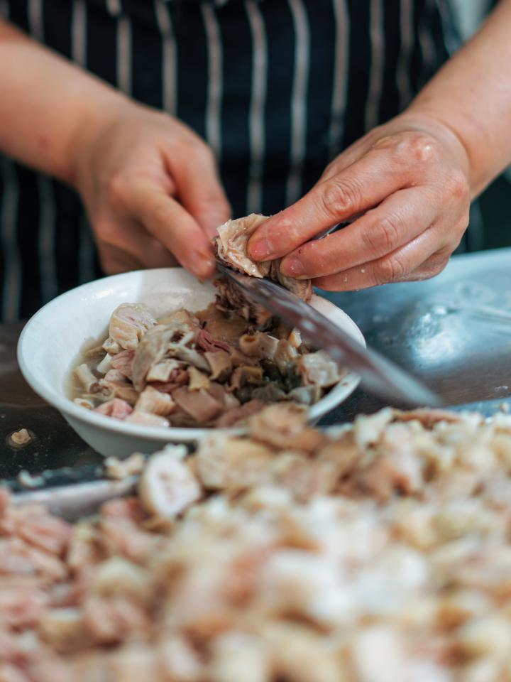 窗户后面的厨子们会根据食客购买的价格来搭配羊杂,身手敏捷的师傅们就着一只小瓷碗,唰唰唰地飞舞着长方形的菜刀,要不是我喊停大姐让我摆拍一张,根本跟不上她这手速。这种切菜技巧也叫“碗边切”,一来可以证明食材已经熬到了入口即化的程度,二来像血肠这类脆弱的食物,可以最大限度的保留完整的形状和光滑的切面。