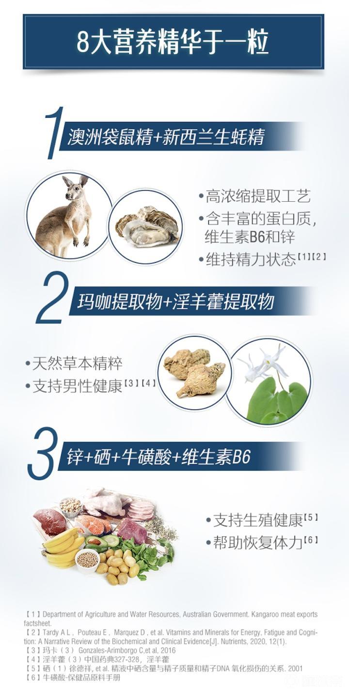 东方的淫羊藿、新西兰的生蚝精,澳洲的袋鼠精、南美的玛咖,与锌、硒、牛磺酸、维生素B结合。帮助提高男性机能,帮你保持充沛活力,提升男性魅力。如同明星球员一般闪耀全场~
