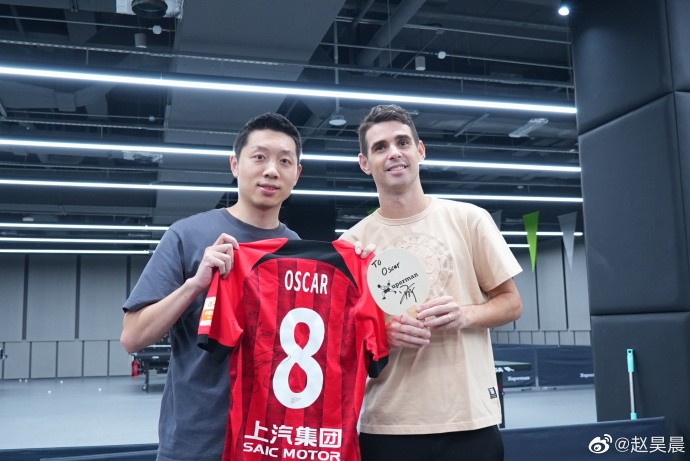 在6日的早些时候,海港球员奥斯卡与许昕在乒乓球台进行了一番切磋。奥斯卡还向许昕赠送自己的签名球衣。