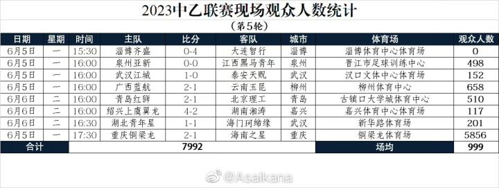 中乙第5轮的比赛全部结束,观众人数方面重庆主场5856人居首,其余主场均未过千。平均观众人数为999人。
