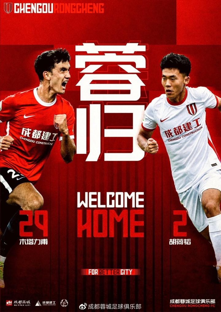 成都蓉城俱乐部官方发文欢迎胡荷韬和木塔力甫结束海外拉练归队:为国争光!蓉城双子星!欢迎回家!