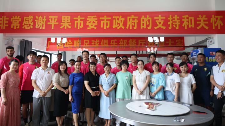 平果政协代表团给俱乐部带来了很多慰问品,宾主双方在位于平果市嘉和馨城1号楼的广西平果哈嘹俱乐部餐厅进行了深入交流。另外,同位于嘉和馨城的俱乐部运动员公寓也已经准备就绪,一线队球员将择日入住。出席活动的领导还有平果市投促局局长冉蓓莎、平果市大唐广告公司董事长韦焰唐、广西平果美佳家电有限责任公司董事长彭文娟,活动还得到了广西平果铝资源科技有限公司、广西子知新材料科技有限公司、广西平果美佳家电有限责任公司、广西富鹏农牧有限公司等企业的大力支持。