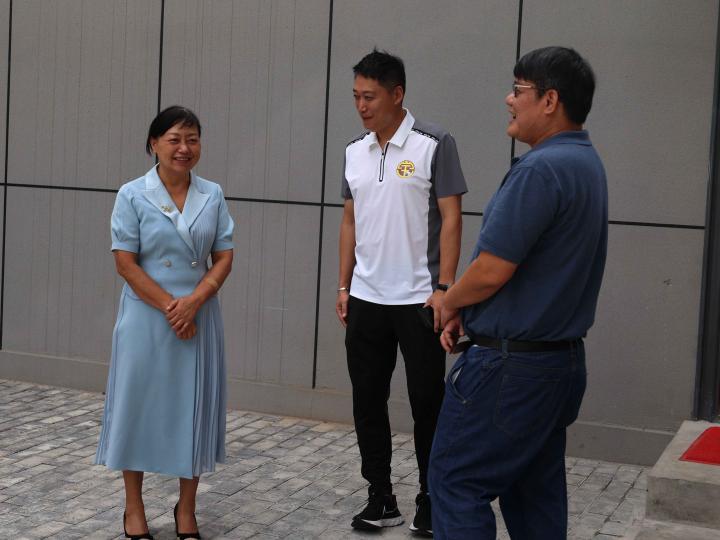 (蒙冬莉主席在与哈嘹足球俱乐部董事长梁振华、总监王霄进行亲切交谈)