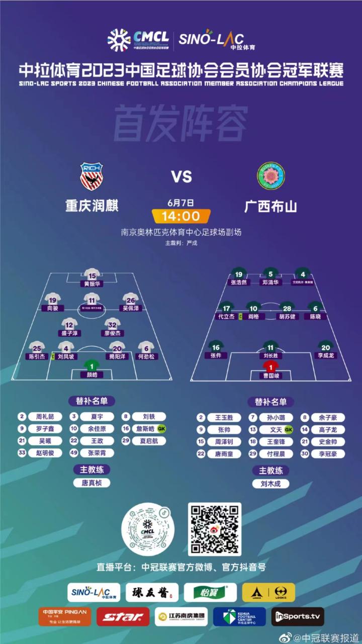 6月7日14:00,南京奥体中心足球场副场,中冠大区赛南京赛区M组第二轮,广西布山对阵重庆润麒 ,双方迎来生死战。重庆润麒主帅唐真桢安排刘凤坡担任队长,颜皓司职门将,黄振华、向骏、廖俊杰等球员首发亮相;广西布山主帅刘木成安排阎格担任队长,曹国峻司职门将,邓清华、陈晓、李成龙率先出战。