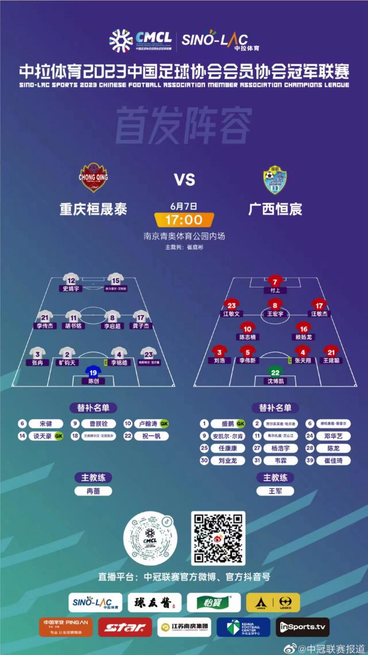 6月7日17:00,南京青奥体育公园内场,中冠大区赛南京赛区N组第二轮,广西恒宸对阵重庆桓晟泰 。重庆桓晟泰主帅冉蔷安排李铭皓担任队长,陈创司职门将,胡书铭、李启超、张冉等球员首发亮相。祝一帆、宋健现身替补席。广西恒宸主教练王军安排张天翔担任队长,沈博凯司职门将,陈志楠、赖扬龙、付上等球员首发。安凯尔、刘业龙、杨浩宇替补待命。