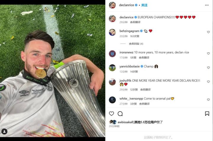 德克兰-赖斯晒出自己与欧协联奖杯合影,配文:冠军来杯冰可罗 @懂球帝2023-06-08 07:47北京时间6月8日凌晨3点,欧协联决赛中,西汉姆联2-1战胜佛罗伦萨,夺得欧协联冠军。赛后,赖斯在个人社交媒体上晒出自己了与欧协联冠军奖杯的合影,并配文:冠军。在个人社交媒体上,赖斯晒出了与欧协联冠军奖杯的合照,配文道:冠军。本赛季,赖斯代表西汉姆联在各项赛事中出场49次,打进5球并奉献4次助攻。据此前消息,阿森纳和拜仁有意引进德克兰-赖斯,这位球员的转会费预计将达到1亿欧元。展开更多