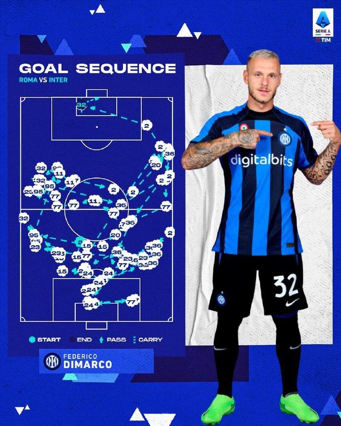 (图)对阵罗马,从卢卡库夺取球权开始,国米全队共完成50次不间断(对方不触球)的传球,最终完成得分。