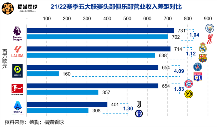 遗憾的是,即便如此,大黄蜂还是比南部之星“小”太多了。21/22赛季财报显示,拜仁的营业收入高达6.54亿欧元,排名德勤足球财富榜第6,而多特的营收只有3.57亿,排名第13,二者差了将近一倍。纵观五大联赛,只有法甲头部两支球队的规模差距比德甲还大。