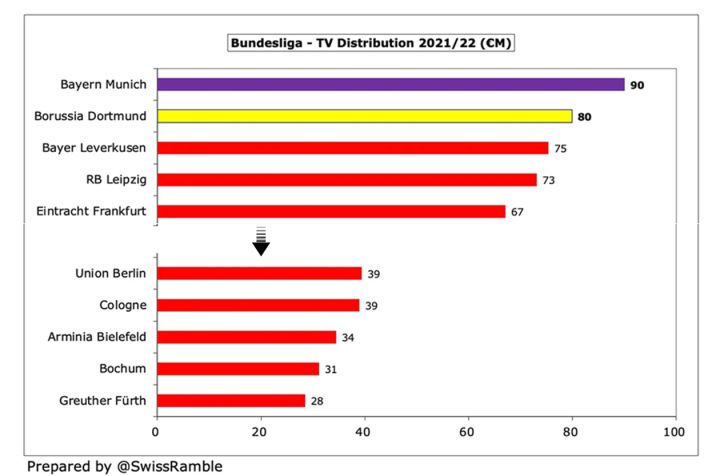 那么是否可以从转播收入分配制度下手呢?现行方案中有53%的国内转播收入和35%的国际转播收入由各队均分,剩余部分多基于球队近5年和10年的联赛表现决定,更有利于老牌势力,尤其是一枝独秀的拜仁。