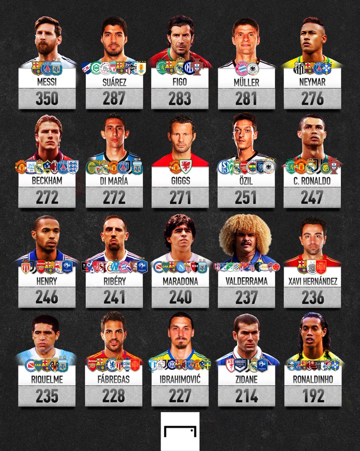职业生涯助攻数超过300个的仅梅西一人,排名第二的则是苏亚雷斯,他职业生涯共计献上287次助攻,但距离梅西还有着近70次的差距。纵观这份榜单,职业生涯仍有理论追赶机会的仅有穆勒与内马尔。