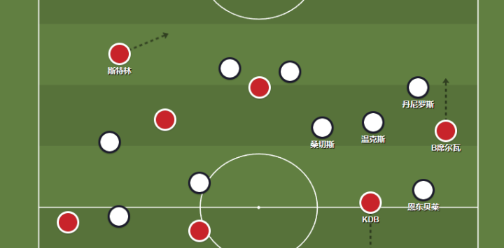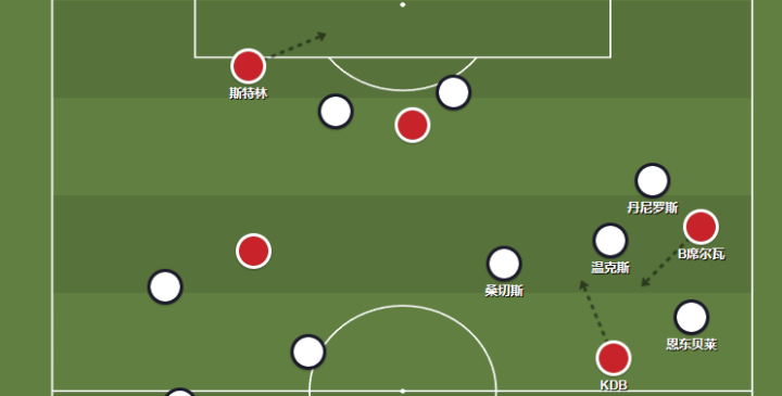 随后斯通斯大斜传B席,B席带球和德布劳内形成交叉跑位,回收球权给阿坎吉
