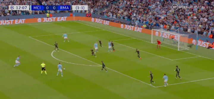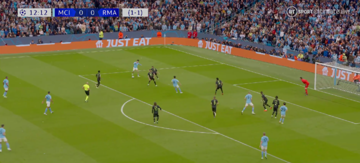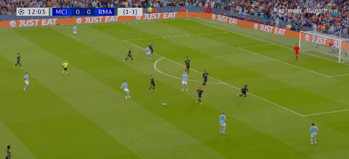 阿坎吉分给格拉利什,格拉利什此时可以1v1,但是此时皇马的后方已经被哈兰德吸引成一片混乱,京多安无人盯防,同时米粒唐居然弃防。格拉利什果断选择起高球给哈兰德,险些破门。