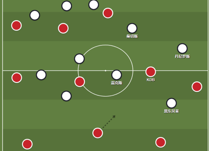 德布劳内瞬间把球转身送到B席脚下,随后B席持球,吸引丹尼罗斯上抢,温克斯补防贴到德布劳内身前,此时德布劳内往后快跑,绕开恩东贝莱,处于无人盯防。