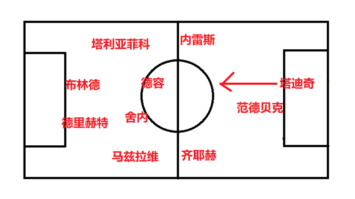 由于伪九号塔迪奇能够回撤用技术串联起球队,这个极为特殊的体系能够让两头的范德贝克、德里赫特施展才华。同时,当赛季的德容尚未“大师化”,仍能看到很多冲刺回防的镜头,虽然有代打中卫拔高防守数据的场次,并且防守技巧糟糕,但球队整体防守够用。在德里赫特的周围,几位相对矮一些的同伴负责打游击,减少对手对德里赫特造成的干扰。