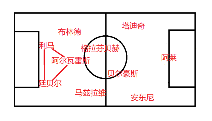 由于塔迪奇的老化,滕哈赫将其放在边路,并且允许左路没有速度。这样整个阵容仅有马兹拉维一个速度相对较快的点。损失纵向速度的补偿是塔迪奇、安东尼会快速地把球从左向右、从右向左传导,加快横向速度。格拉芬贝赫作为组织型8号位上下往返,布林德内收辅助,后场防守强点阿尔瓦雷斯带动利马、廷贝尔两个矮中卫扫荡。利马放在后腰位置机动性不够,腿也不够长,南美防守球员特有的“使坏”因为粘不上人(全TM是人)而无从发挥;但放在中卫位置有了一层缓冲,就能够扬长避短。