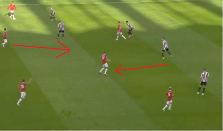 在萨比策边路控球的时段,B费被压在后场无法用无球给进攻制造层次,拉什福德、卢克肖的区域也遭到了挤压。