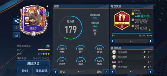 ○ 五周年活动推出的德波尔基础能力值仅为139,不过他的强度却丝毫不比大多数同能力值球员差,配备叹息之墙天赋后,德波尔的防守端表现也有一定提升。