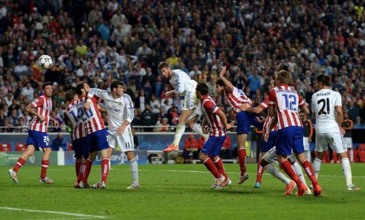 2013-2014赛季的欧冠决赛又是一场德比之战,来自马德里的两只球队在葡萄牙里斯本的光明球场相遇,分别是C罗领衔的皇家马德里和铁血防守著称的马德里竞技。当时两队的主教练分别是安切洛蒂(皇家马德里)和西蒙尼(马德里竞技)。皇马在淘汰赛中先后淘汰了沙尔克04、多特蒙德和拜仁慕尼黑,马竞则是淘汰了AC米兰、巴塞罗那和切尔西。